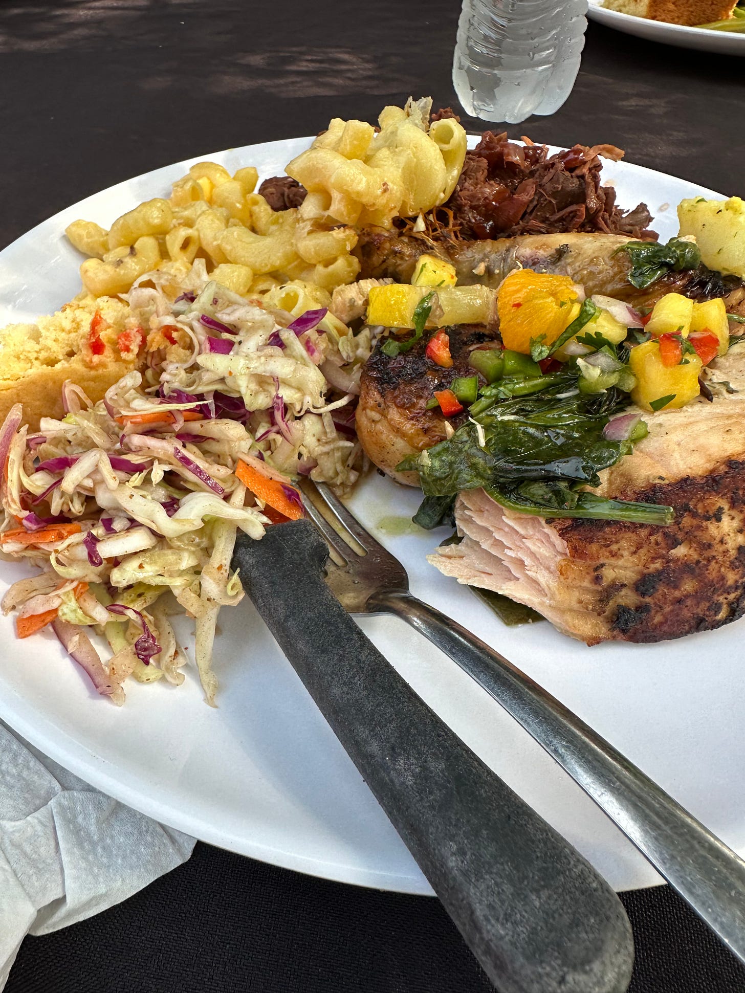 The pretty lunch I describe above and below on a white (what is this material) non-paper plate, along with a fork and a steak knife shoved unceremoniously into the gigantic coleslaw. Napkin wrinkled by anxiety is underneath the plate. Signature plastic water bottle. A corner of someone else’s food. There is also some cornbread. I forgot to take a picture before eating, since I was hungry, and we had less than 30 minutes.