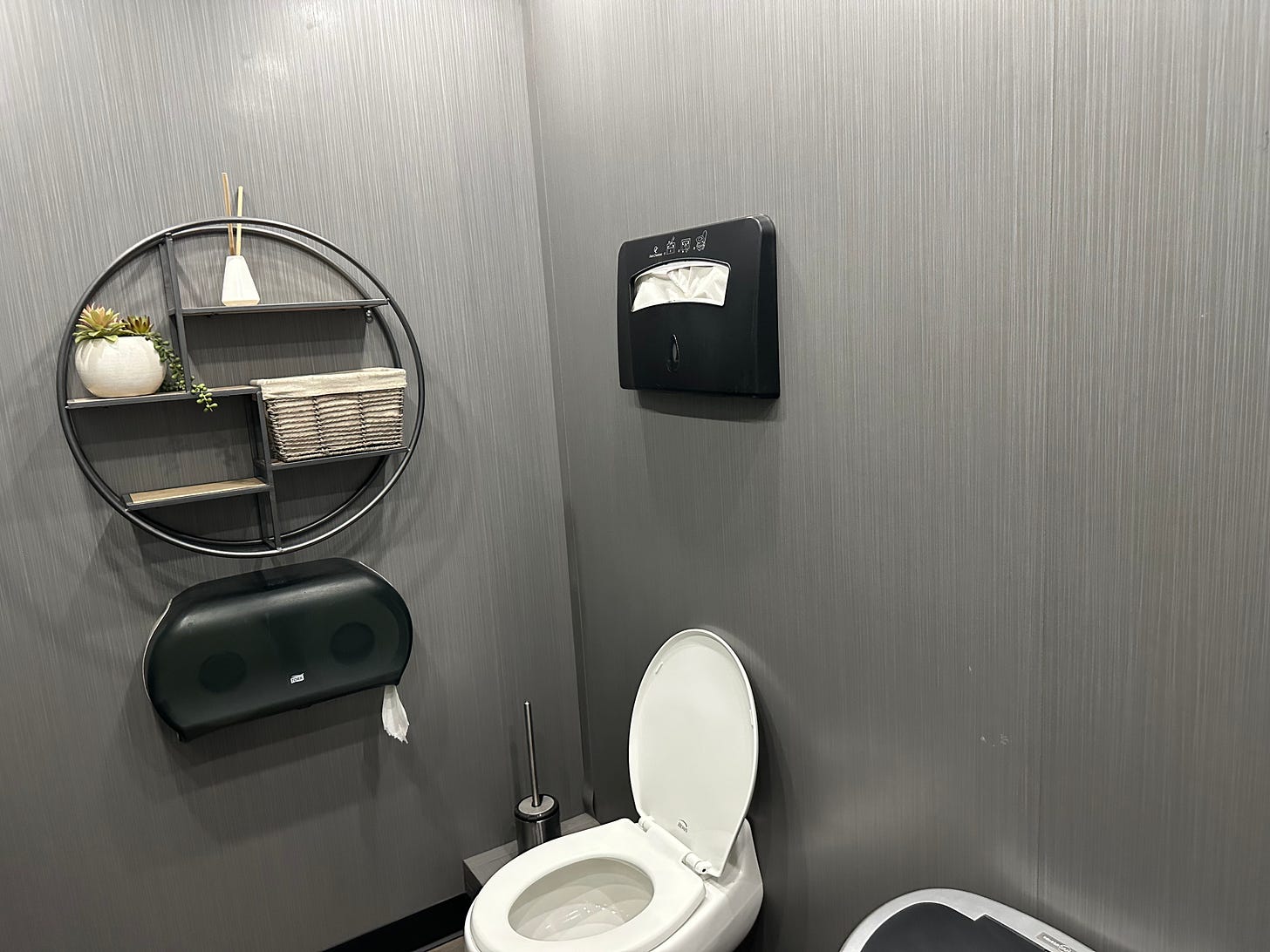 Taken at a clever angle to hide the piece of toilet paper on the ground (NOT FROM ME) that soils the artistry. They even have a toilet brush in a matching silver color! The standard stuff in a toilet (automatic trash can, toilet cover dispenser, toilet paper holder with TWO FULL ROLLS, and a special, artsy, circle-shelf thing with a potted plant, some (?? aroma sticks??), and… some cloth/paper towels that are artfully stacked??)