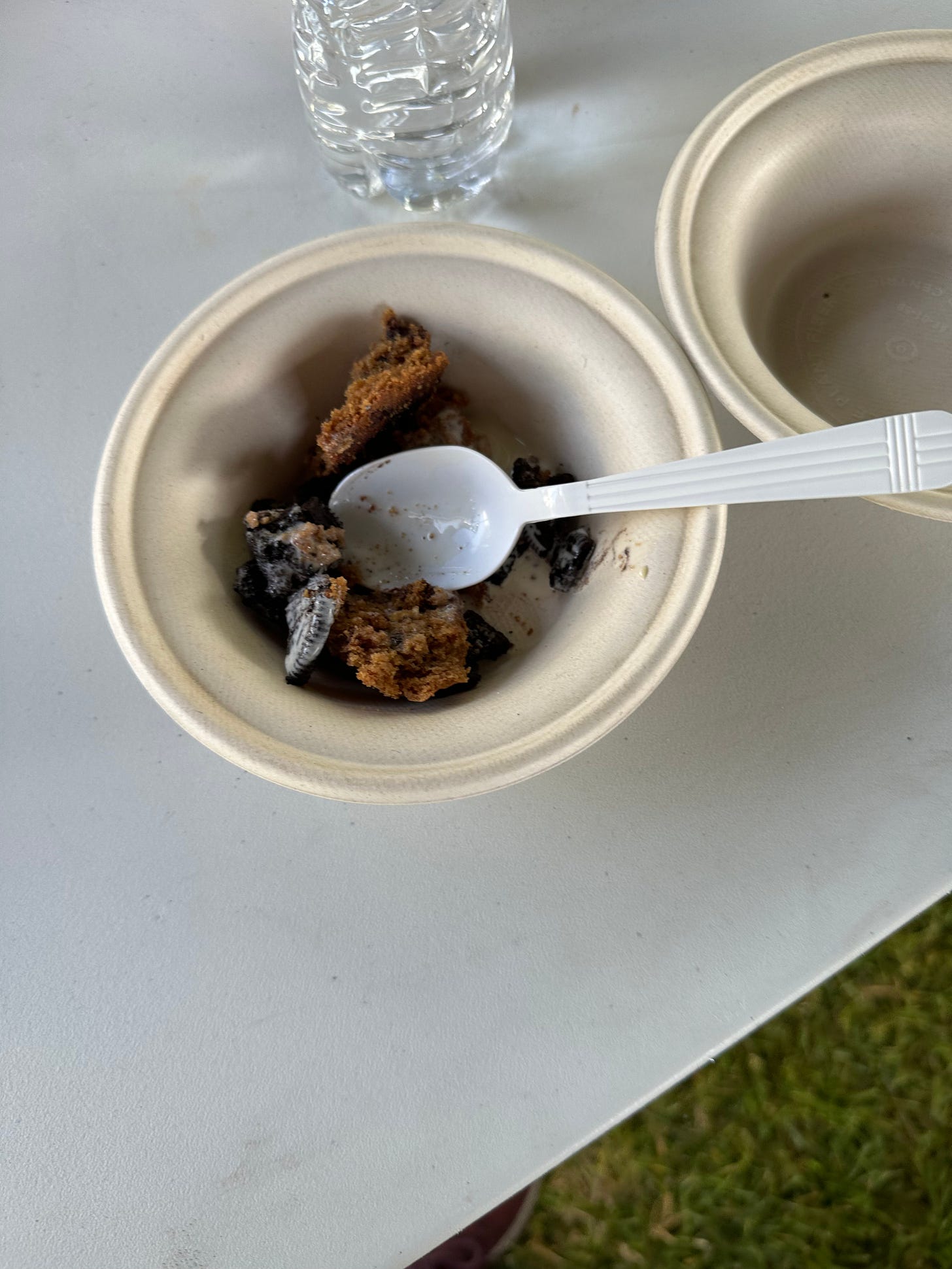 Plastic water bottle. Plastic spoon in paper bowl with said brownie, some Oreo toppings, and bird droppings vanilla ice cream. Gives you nostalgia for 5th grade class parties. All on top of a white table and a small triangle of grass.